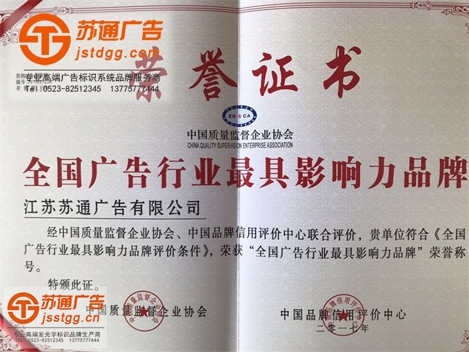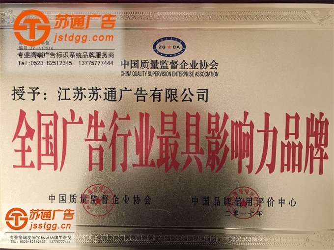 最近蘇通又榮獲獎(jiǎng)牌、獲獎(jiǎng)證書,經(jīng)過(guò)中國(guó)質(zhì)量監(jiān)督企業(yè)協(xié)會(huì),中國(guó)品牌信用評(píng)價(jià)中心聯(lián)合評(píng)價(jià),江蘇蘇通廣告有限公司符合«全國(guó)廣告行業(yè)最具影響力品牌評(píng)價(jià)條件»,榮獲“全國(guó)廣告行業(yè)最具影響力品牌”。熱烈慶祝江蘇蘇通廣告有限公司被中國(guó)質(zhì)量監(jiān)督企業(yè)協(xié)會(huì),中國(guó)品牌信用評(píng)價(jià)中心授予“全國(guó)廣告行業(yè)最具影響力品牌”,希望蘇通廣告能在成長(zhǎng)進(jìn)步的道路上越走越遠(yuǎn)!