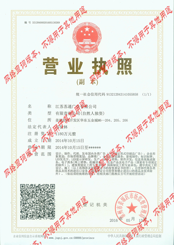 江蘇蘇通廣告有限公司的前身為泰州天地廣告?zhèn)髅接邢薰?,公司成立?003年,2014年因公司發(fā)展需要改名為江蘇蘇通廣告有限公司,公司注冊資本1180萬元,主要設(shè)計,制作各類戶外廣告,門頭招牌,高炮廣告牌,led顯示屏,發(fā)光字,噴繪寫真,墻體廣告,樓體亮化等,公司在泰州,姜堰,上海,吳江都有分公司,營業(yè)執(zhí)照是企業(yè)或組織合法經(jīng)營權(quán)的憑證?!稜I業(yè)執(zhí)照》的登記事項為:名稱、地址、負責(zé)人、資金數(shù)額、經(jīng)濟成分、經(jīng)營范圍、經(jīng)營方式、從業(yè)人數(shù)、經(jīng)營期限等。營業(yè)執(zhí)照分正本和副本,二者具有相同的法律效力。正本應(yīng)當置于公司住所或營業(yè)場所的醒目位置,營業(yè)執(zhí)照不得偽造、涂改、出租、出借、轉(zhuǎn)讓。