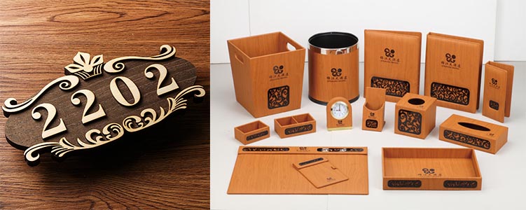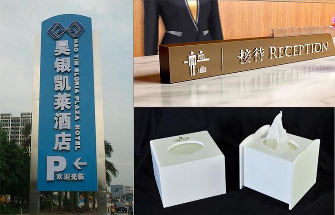 酒店用品從水晶字、金屬字、亞克力字的切割,到指示牌、服務(wù)牌、門牌、樓牌的雕刻;從名片盒、紙巾盒、桌位牌的雕刻到塑料開關(guān)、插卡牌、吹風(fēng)機(jī)的打標(biāo),體現(xiàn)的都是激光設(shè)備的痕跡。