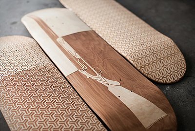 激光雕刻滑板是使木板表面受到強(qiáng)大的激光熱能而溫度急劇增加,使該點(diǎn)因高溫而迅速的融化或者汽化,配合激光頭的運(yùn)行軌跡從而做出想要的圖形文字。激光雕刻速度快,精度高、無論何種形狀何種圖案都可以精準(zhǔn)快速成型。